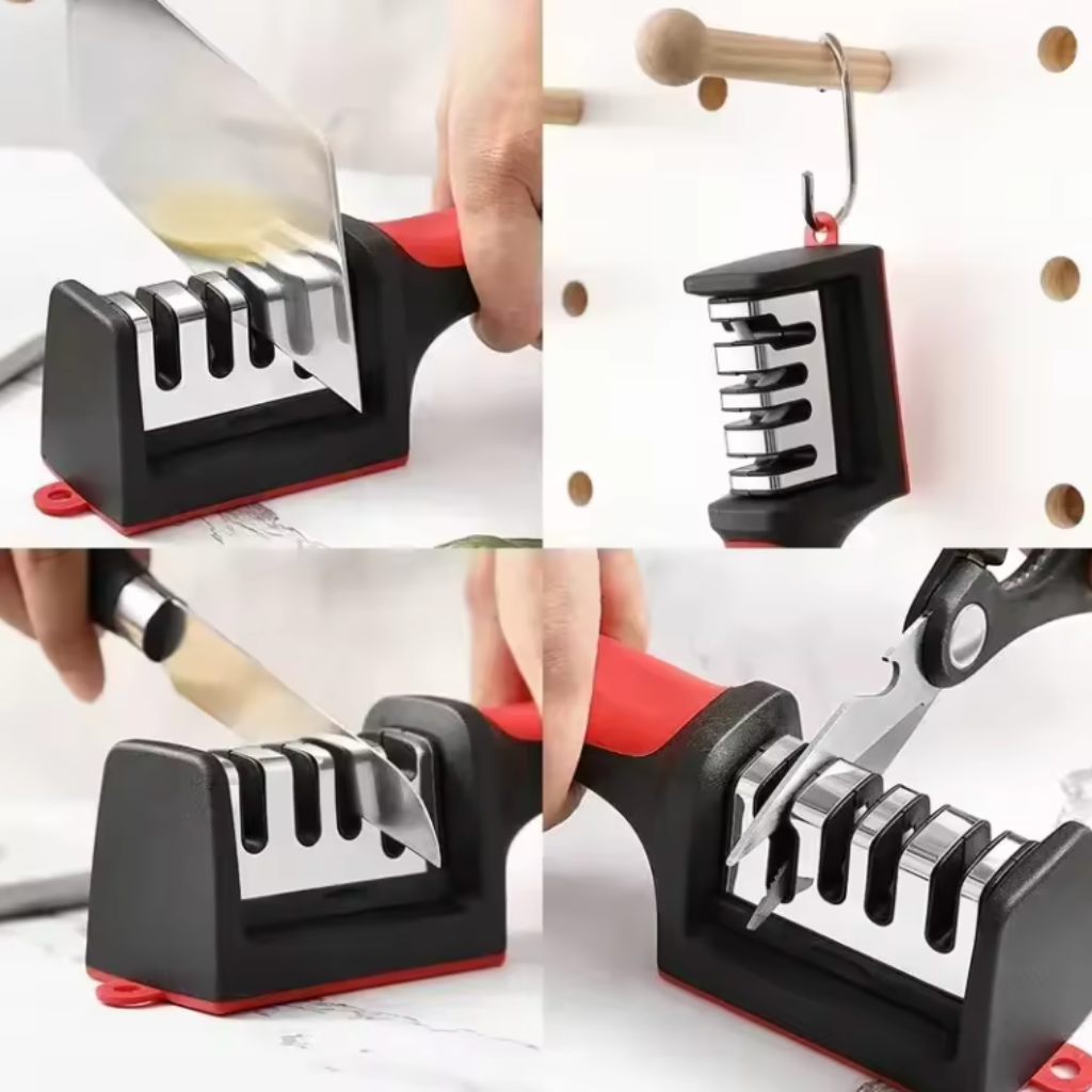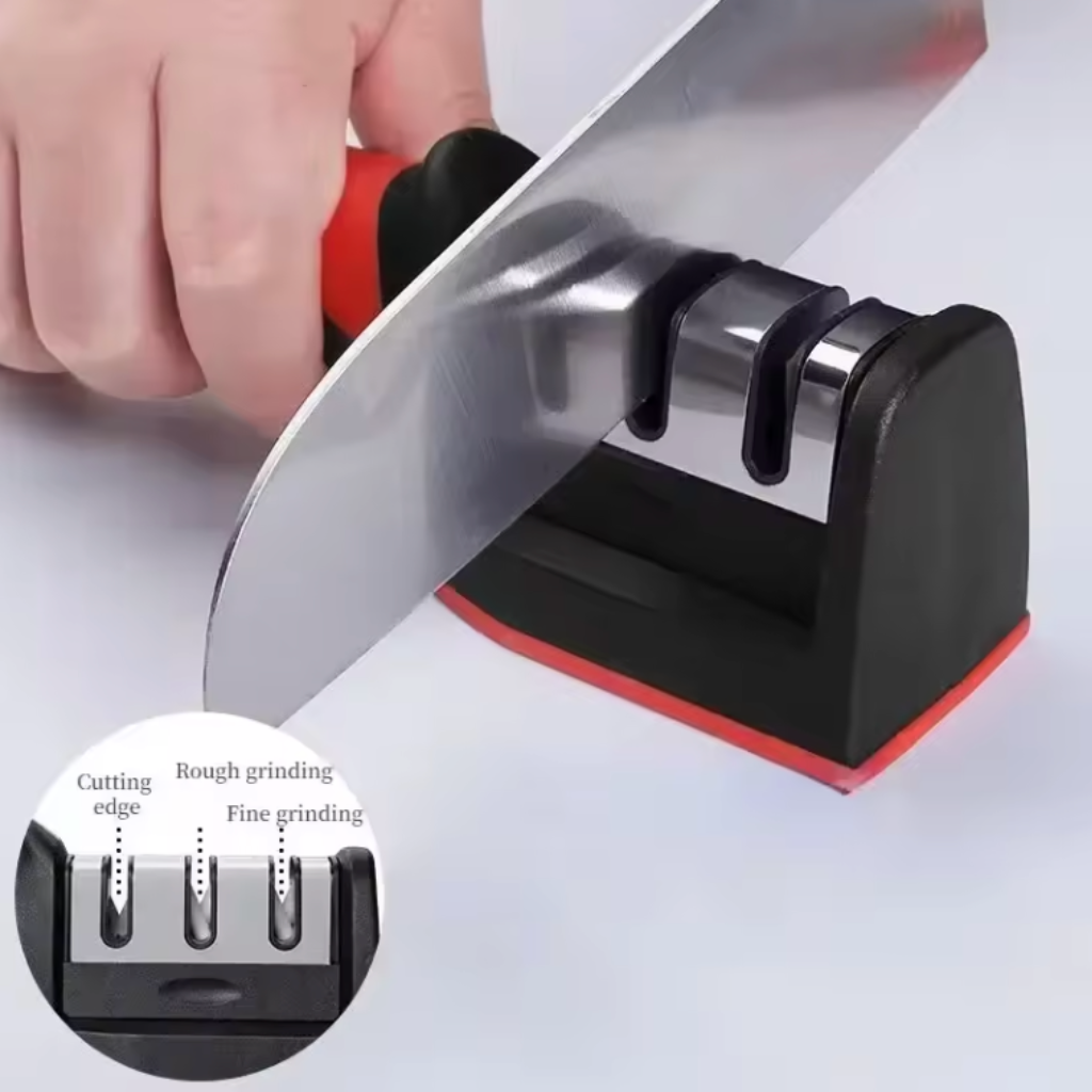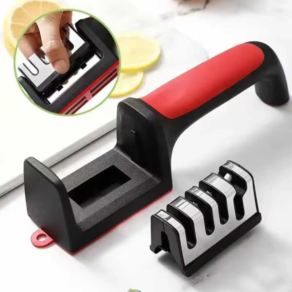 El mecanismo interno combina abrasivos de distinta granulometría que trabajan en etapas: primero corrigen imperfecciones y mellas leves, luego refinan el filo hasta recuperar un corte limpio, suave y uniforme. Este proceso está pensado para que cualquier persona—con o sin experiencia—pueda lograr un afilado consistente sin riesgo de deteriorar el cuchillo.